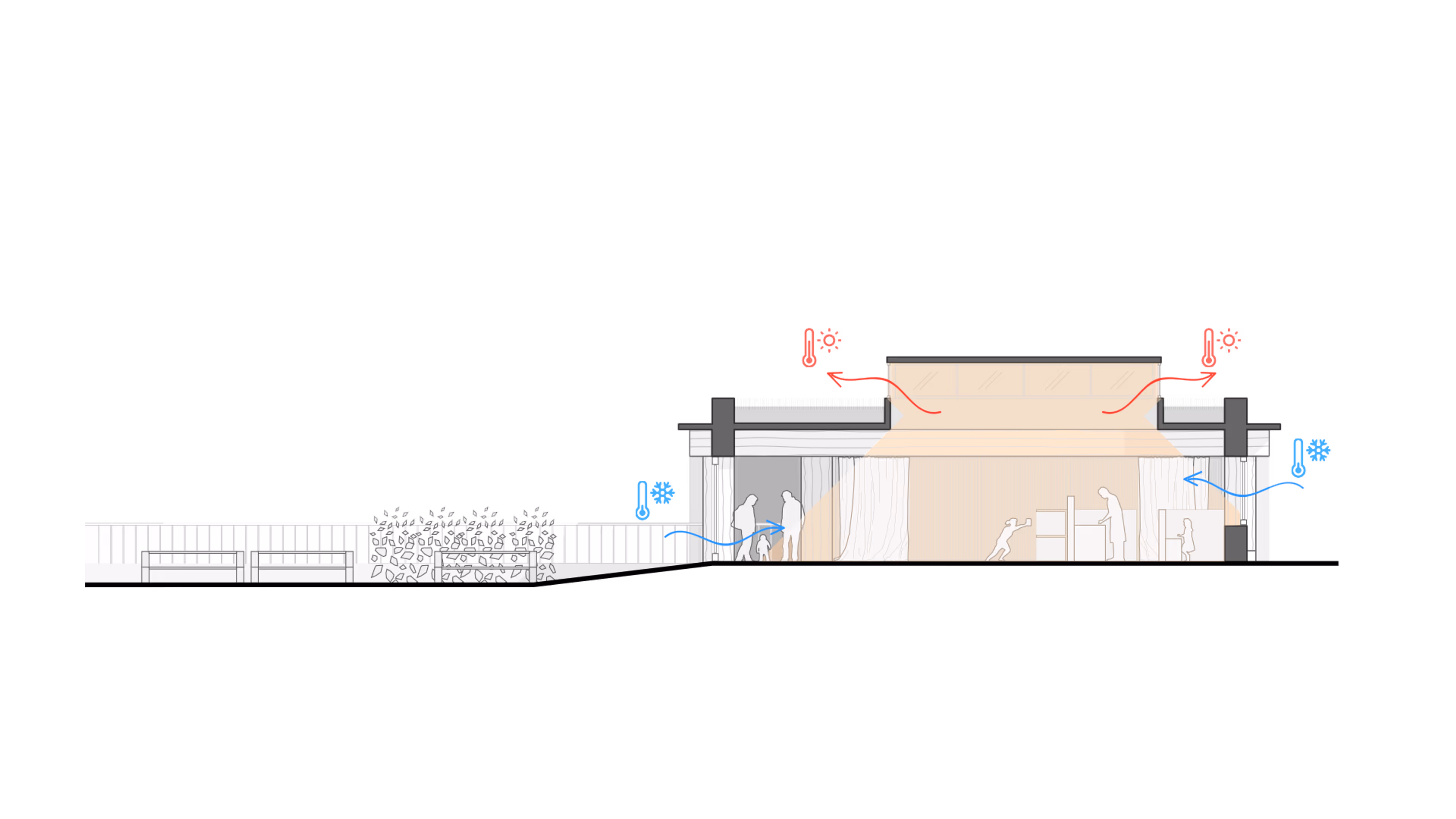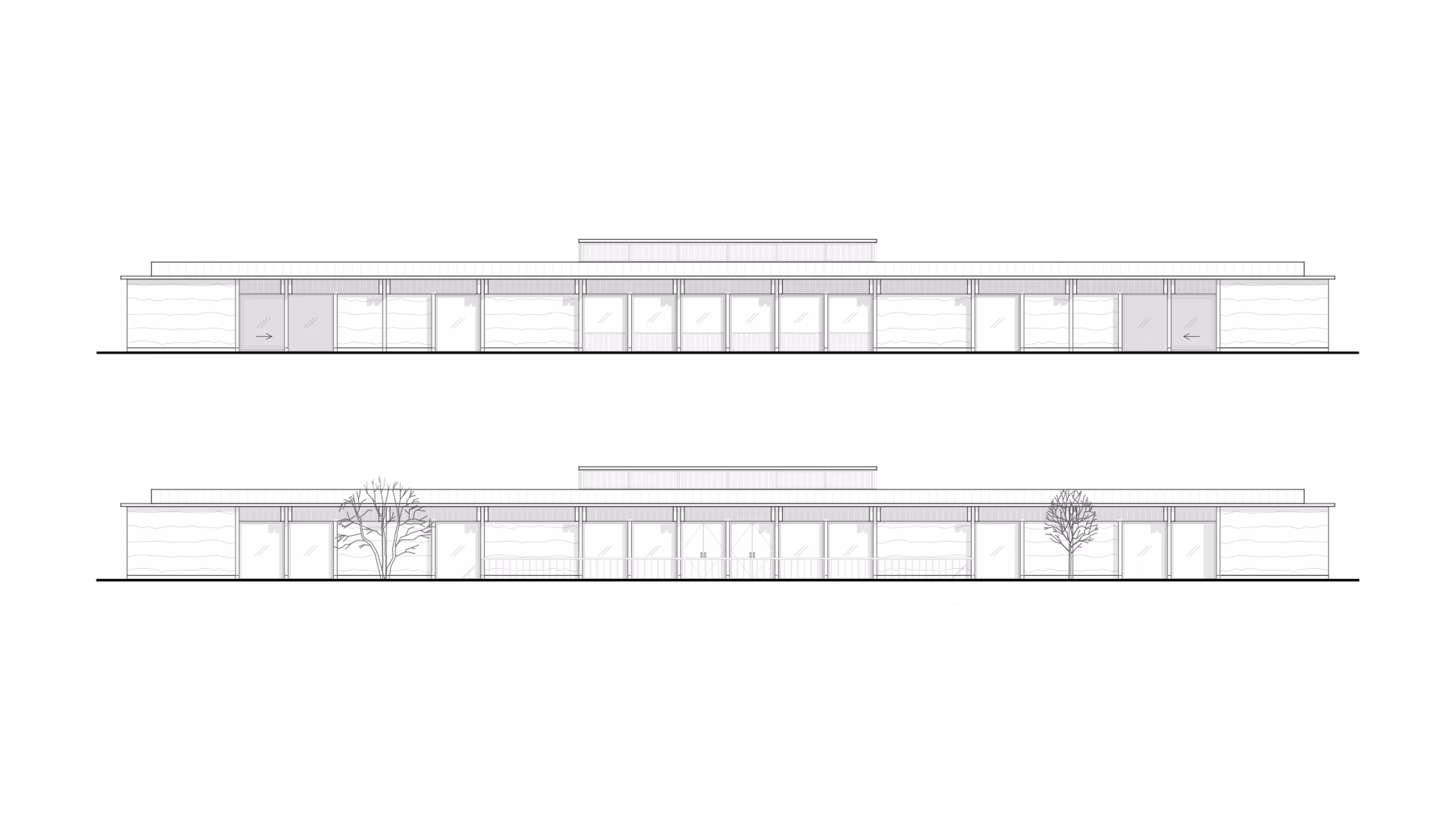 Versatile structural “arches,” formed by parallel beams and columns, adapt to various needs. Each arch can be opened, closed, made opaque, or transparent, ensuring simplicity and adaptability throughout the design.