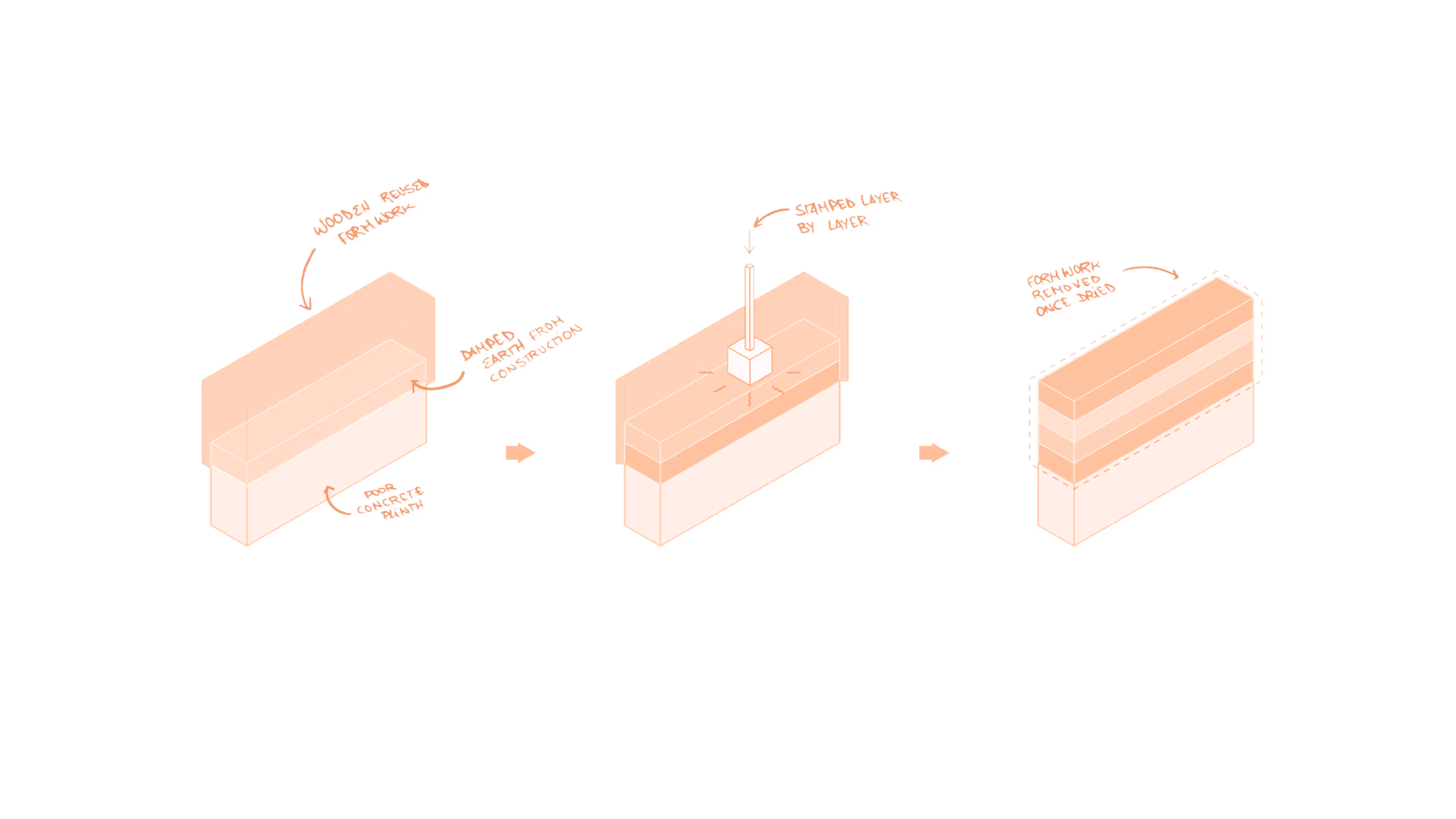 At its core, it is a sustainable solution. Excavated soil, often discarded as waste, is repurposed into the primary material for building walls, informing the design language and connecting the structure to its context.